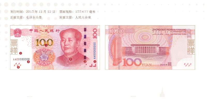票面正面左下方和背面右下方均有面额数字“100”的局部图案。透光观察,正背面图案组成一个完整的面额数字“100”。